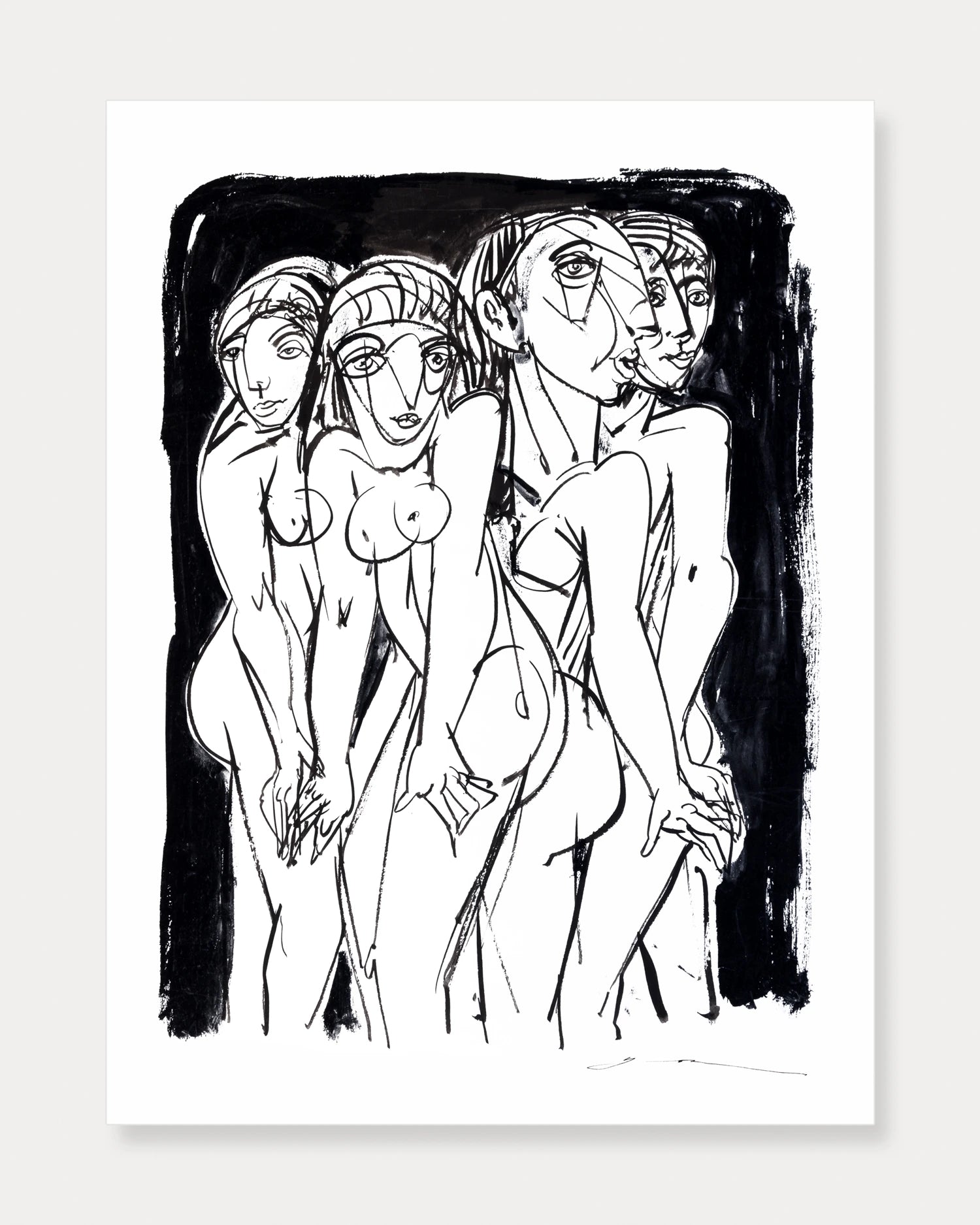 «Chicas Desnudas» de Juan Francisco Yoc es una cautivadora impresión de fine art basada en el dibujo original del artista, realizado con tinta china negra sobre papel blanco. Con maestría expresiva y profundidad emocional, Yoc rinde homenaje a Picasso y al espíritu innovador de «Las señoritas de Avignon», reinterpretando su esencia a través de su propia visión contemporánea.