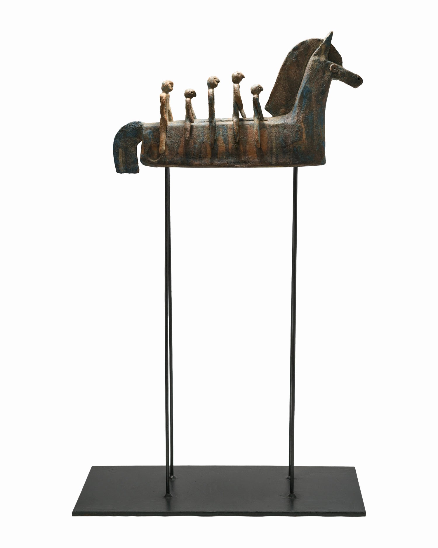 Esta obra, Domingo de Paseo de Jacqueline Schreier, inspirada en el arte primitivo y conservando su sentido del humor, representa un caballo montado por varios jinetes de diferentes tamaños. Podría tratarse de una familia saliendo de paseo dominical, de ahí el nombre de la obra. Es una obra minimalista que refleja el enfoque de Schreier hacia los animales y el carácter lúdico de su trabajo. Es una obra con un enfoque lúdico, donde un gran caballo lleva sobre su lomo a cinco personajes de diferentes tamaños, con formas simples, sencillez y austeridad, donde no queda claro si están desnudos o si se trata solo de una representación minimalista de la figura humana cabalgando libremente sobre el caballo, que bien podría estar inspirada en una figura etrusca.