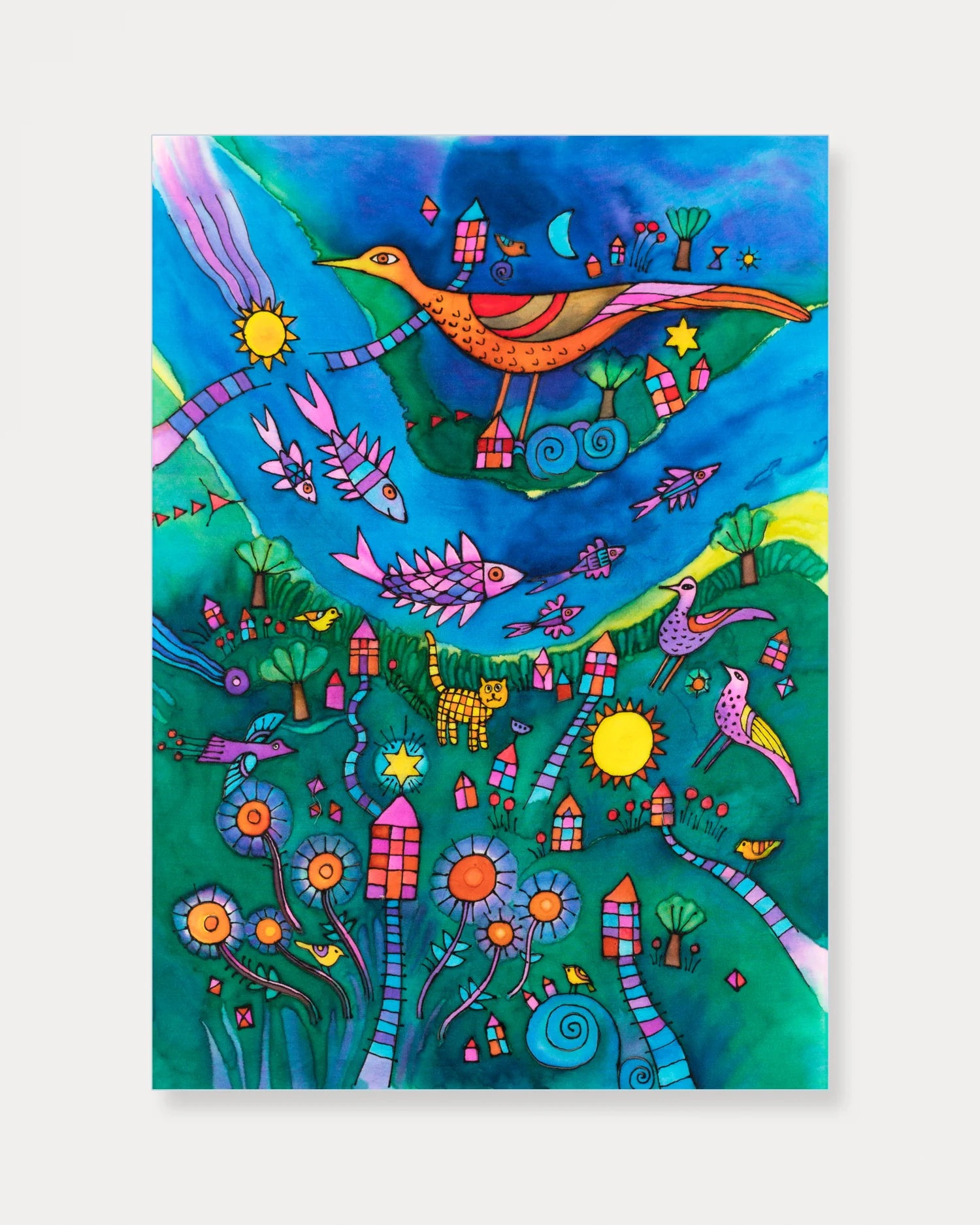 «El sueño del ave», de Jacqueline Schreier, es una obra encantadora y luminosa que invita al espectador a un mundo de imaginación y fantasía. Originalmente creada sobre seda, esta exclusiva lámina artística de And-Art Works irradia una excepcional riqueza cromática, donde los tonos se funden delicadamente gracias a la suavidad del material. En la escena, el agua fluye como un río repleto de peces, fundiéndose con el cielo como si las criaturas volaran entre las nubes. Abajo, un campo vibrante y un pueblo florido completan este paisaje onírico, habitado por animales y formas llenas de vida. Con su estilo figurativo y toques ingenuos, la obra transmite inocencia, creatividad y armonía, ideal para espacios que buscan alegría, color y poesía visual, como la habitación de un niño o un espacio de arte contemporáneo.