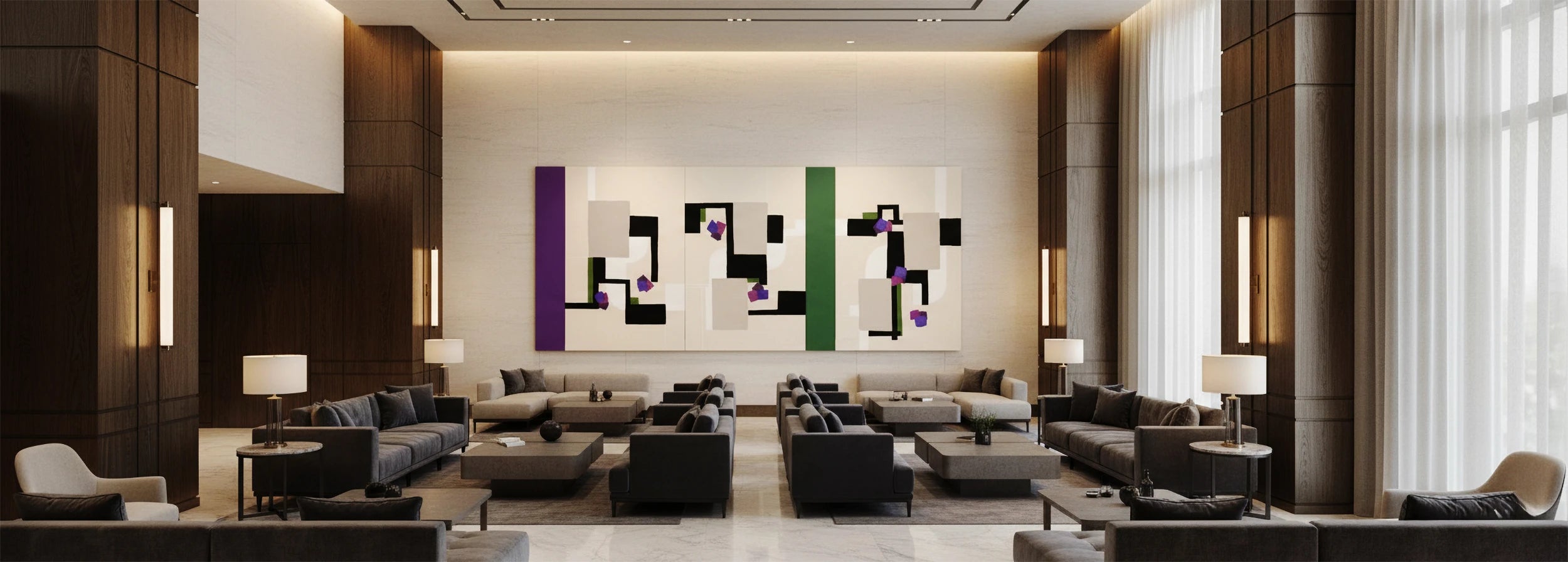 We develop focal artworks for public areas, lobby statements and coordinated edition programs for multi-room implementation — balancing visual impact with operational consistency. -