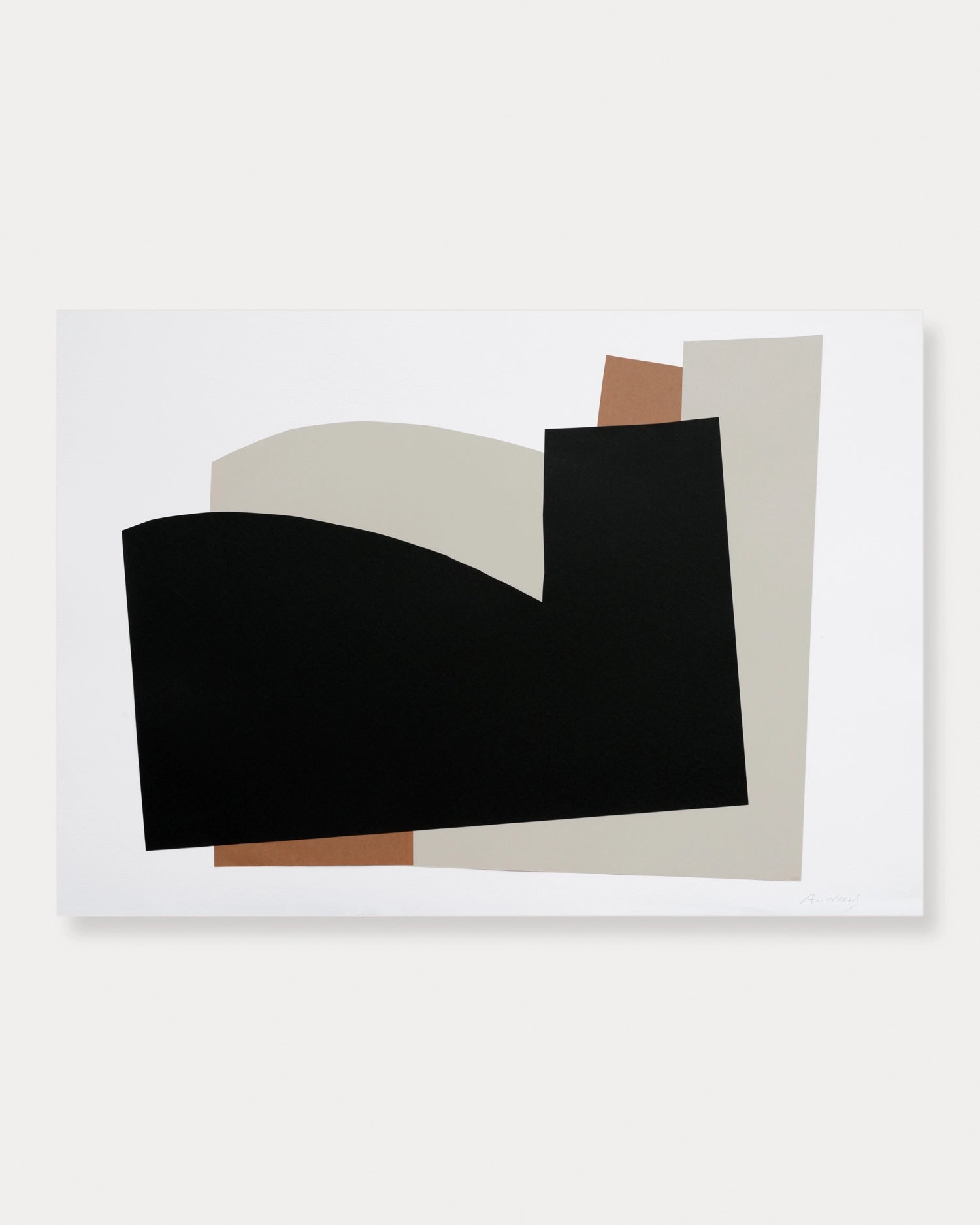 In this refined composition, black, brown, and gray tones blend seamlessly with white, creating a harmonious play of light, contrast, and spatial rhythm. The large geometric and circular shapes seem to float in a tranquil, flat space, evoking a sense of modern elegance, calm, and poetic restraint.