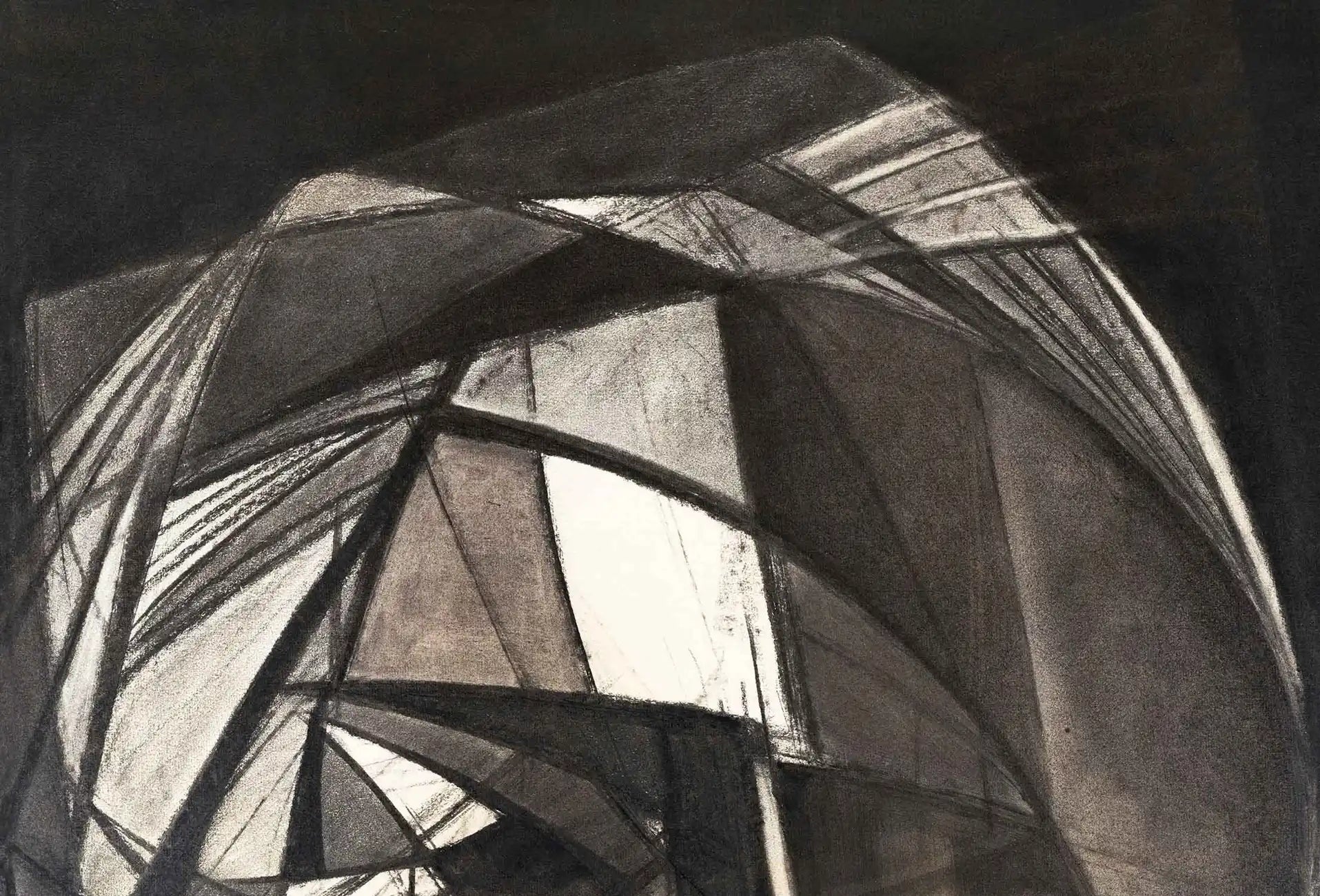Atlas is a charcoal drawing on paper measuring 100 x 70 cm (39.4 x 27.6 in), and with its wooden frame, the work reaches 103 x 73 x 4 cm (40.5 x 28.7 x 1.6 in). The composition belongs to a geometric expressionist language in which the face becomes a form of visual architecture. The interlocking planes and luminous contrasts evoke a reminiscence of stained-glass windows, as if the drawing were built from fragments of light trapped within a crystalline structure. This subtle “glass-like” sensation enhances the spiritual and symbolic dimension of the piece.