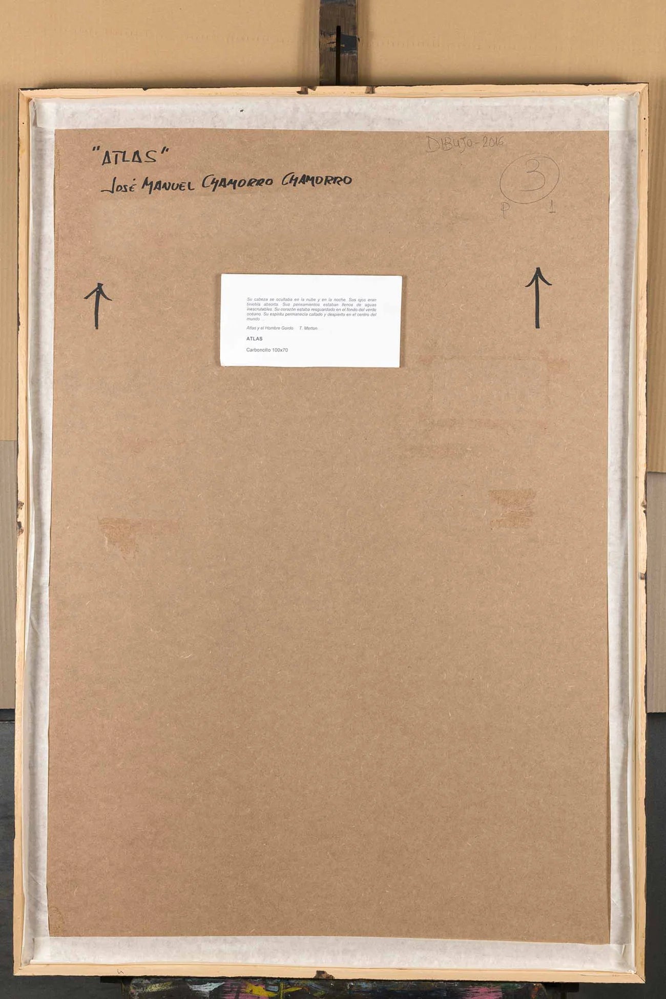 The drawing generates an emotional tension between what is seen and what is concealed, between the rational clarity of geometry and the visceral force of gesture. Chamorro expresses the duality of the myth: Atlas holds the universe, but he also holds his own shadows. His firm, dark and energetic line turns the face into a symbolic territory where resistance, burden, mystery and human introspection converge.