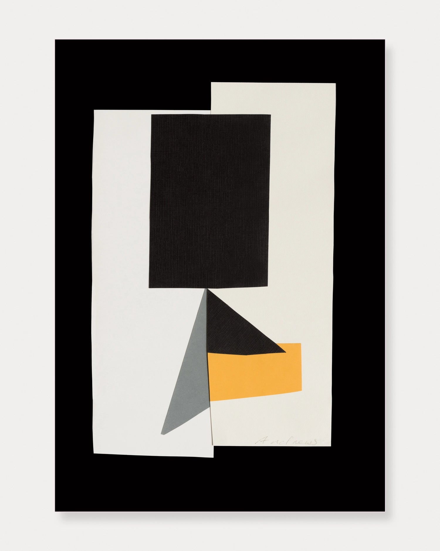 Using a delicate palette of off-white, grey, yellow, and black, Andrews achieves a composition that feels both architectural and poetic. The carefully cut and layered paper elements create subtle depth and texture, emphasizing the artist’s craftsmanship and sensitivity to form and proportion.