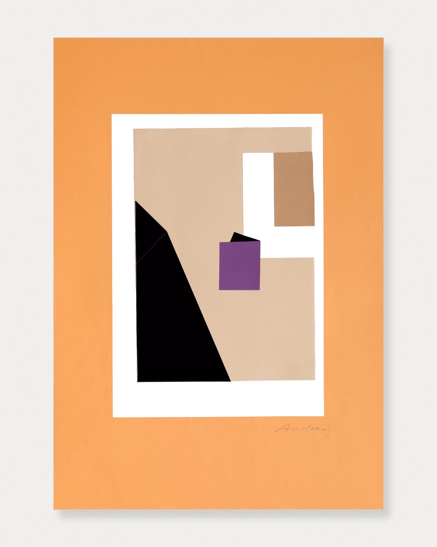 This minimalist collage embodies the artist’s fascination with geometry, color, and silence. Against a vibrant orange background, a white window-like rectangle opens into an interior space where black and violet shape seem to float delicately over a soft beige field.