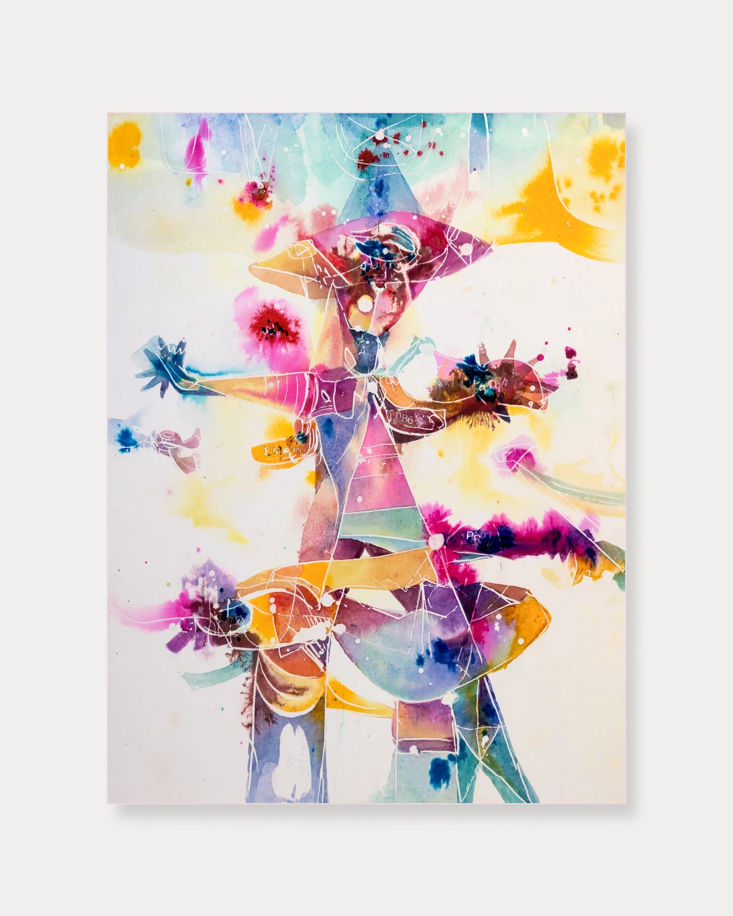 “Cowboy” by Juan Francisco Yoc is a mesmerizing Fine Art Print that blends imagination, geometry, and expressive color into a single poetic vision. Based on the artist’s original watercolor and mixed-media drawing on paper, the work radiates energy, mystery, and a profound sense of craftsmanship.