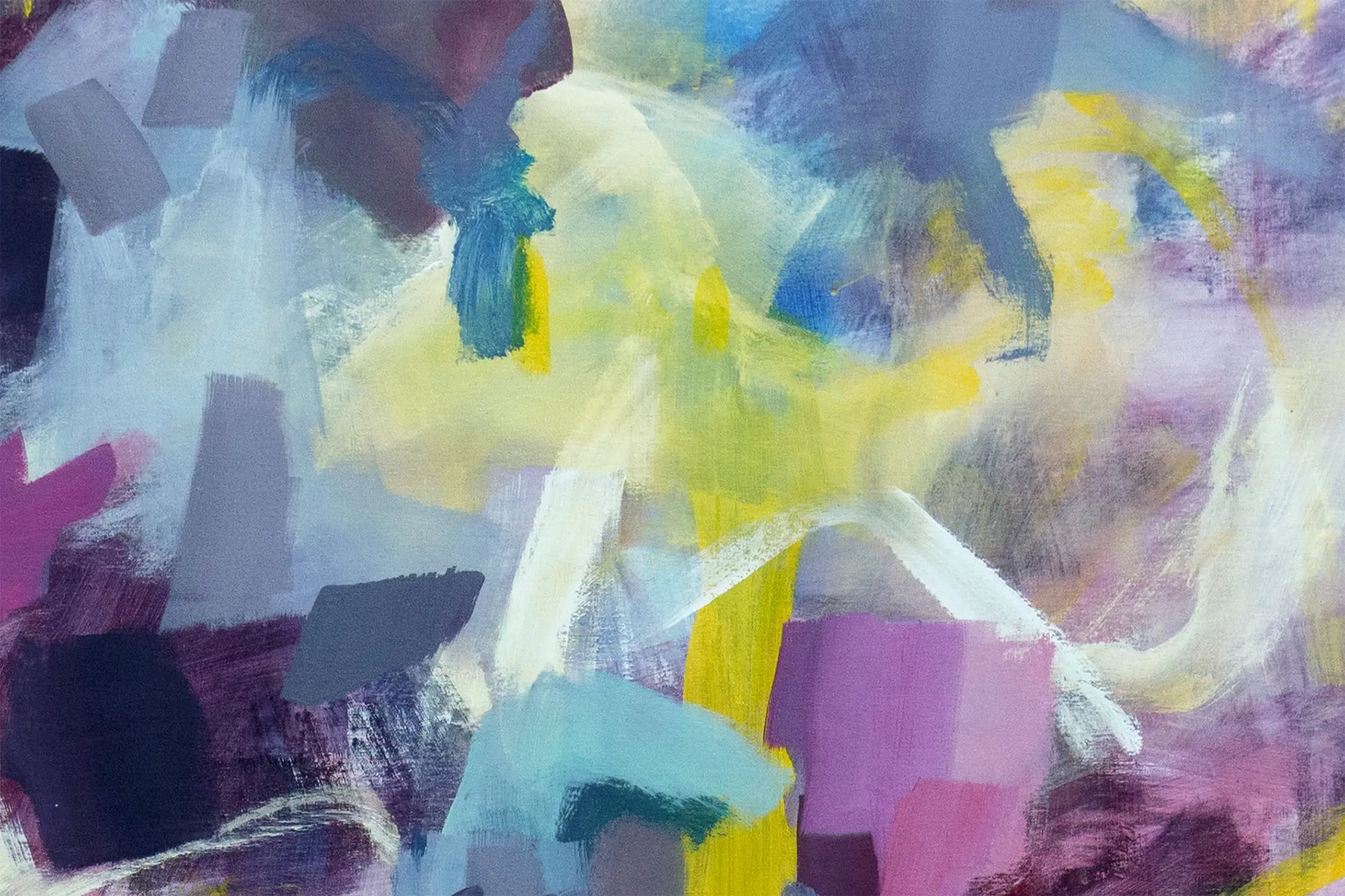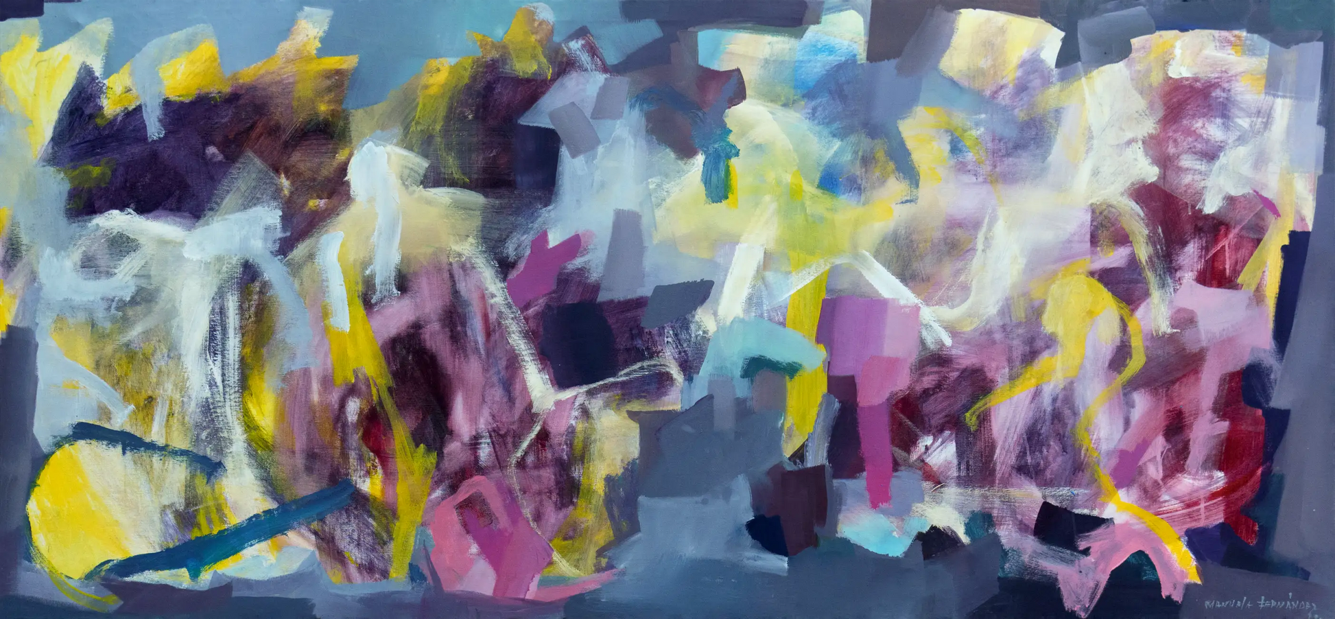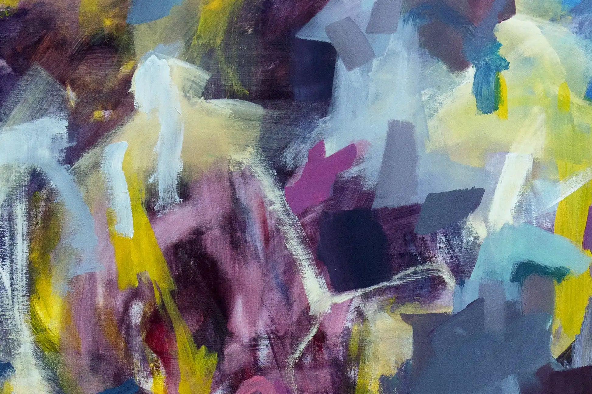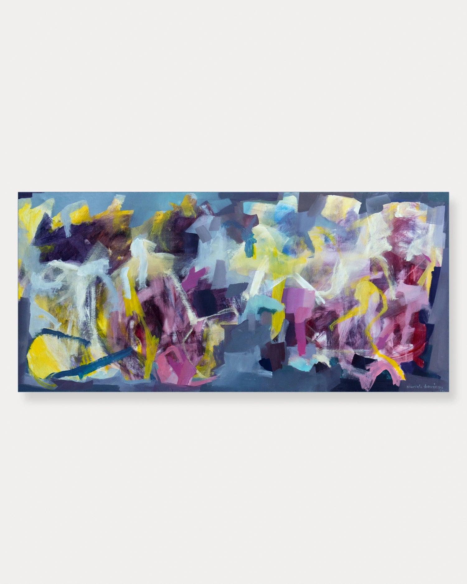 The canvas pulses with overwhelming vitality. Vibrant yellows intertwine with intense pinks, deep violets, and bluish-gray hues, composing a true chromatic symphony of maximalist character. Color is not a companion; it is the protagonist. It guides the viewer on a sensory journey where painting becomes an experience rather than a mere visual object.
