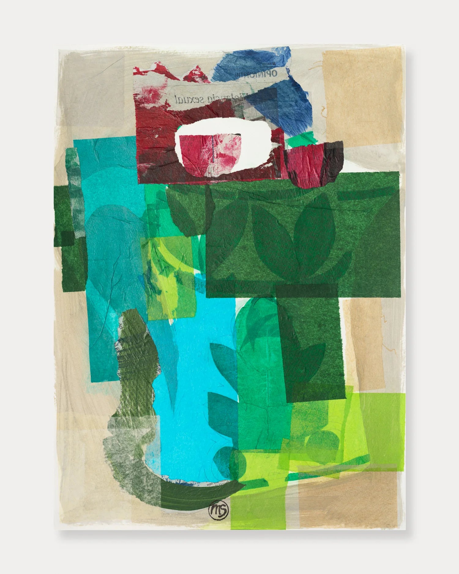 The original collage, part of her 2022 series, brings together layered papers, manipulated cutouts, and acrylic graphic gestures. Solís builds upon a beige background a vibrant palette of greens, reds, blues, and small areas of white, shaping a vegetal universe that emerges through abstraction. With scissors —and often with her hands— she cuts green and blue tissue paper into leaf-like silhouettes, subtle floral hints that float with delicate rhythm across the surface.
