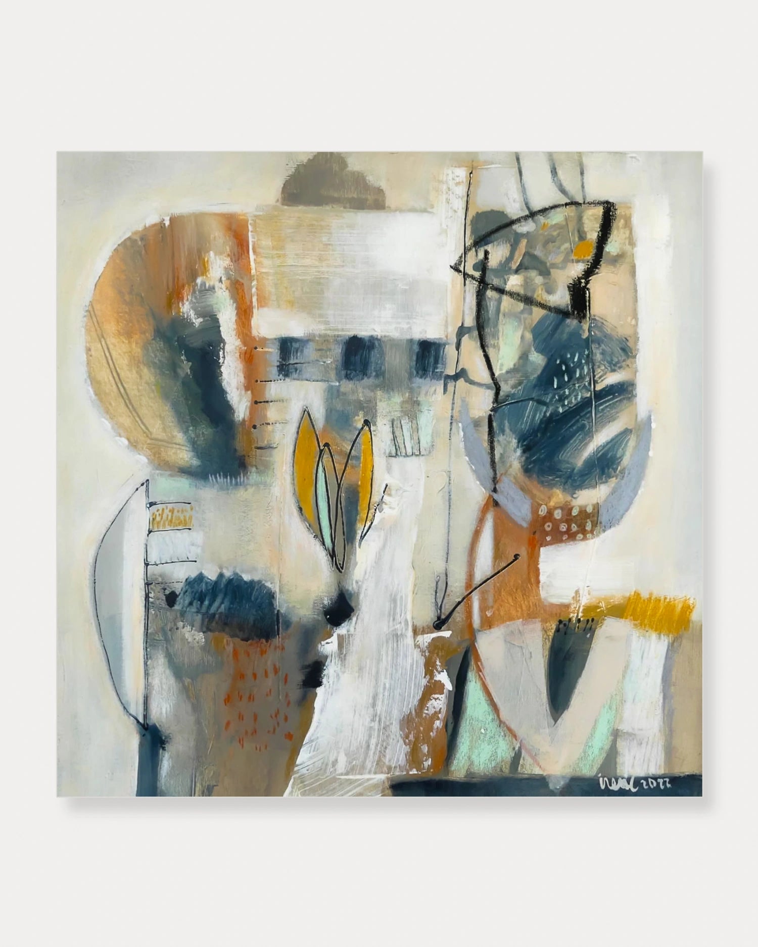 In this fine art print, every gesture recalls the warm, tactile presence of the Mediterranean, with its sunlit textures, ochre sands, and soft beige hues that radiate calm and nostalgia. Delicate figurative traces of plants and flowers emerge through layers of color — deep blues, light greens, glowing yellows, and vibrant orange tones — giving the composition both structure and breath. Subtle black strokes add shadow and depth, creating a rhythm that invites the viewer to wander through the canvas like through a dreamlike garden.