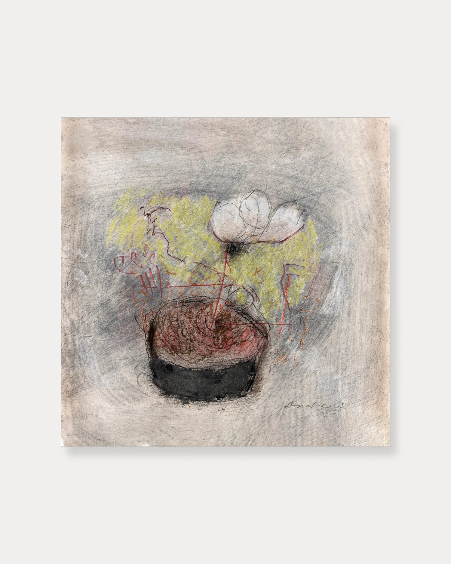 Executed with colored pencils, graphite, charcoal, acrylic, and wax, the work creates a unique atmosphere where the flower seems to vibrate within the composition, surrounded by a halo of light that enhances its presence. Andrews’ free and gestural strokes reduce the form to its essence, balancing between figuration and abstraction: it is clearly recognizable as a white flower in a pot, while simultaneously serving as a poetic interpretation of everyday life elevated into a visual experience.