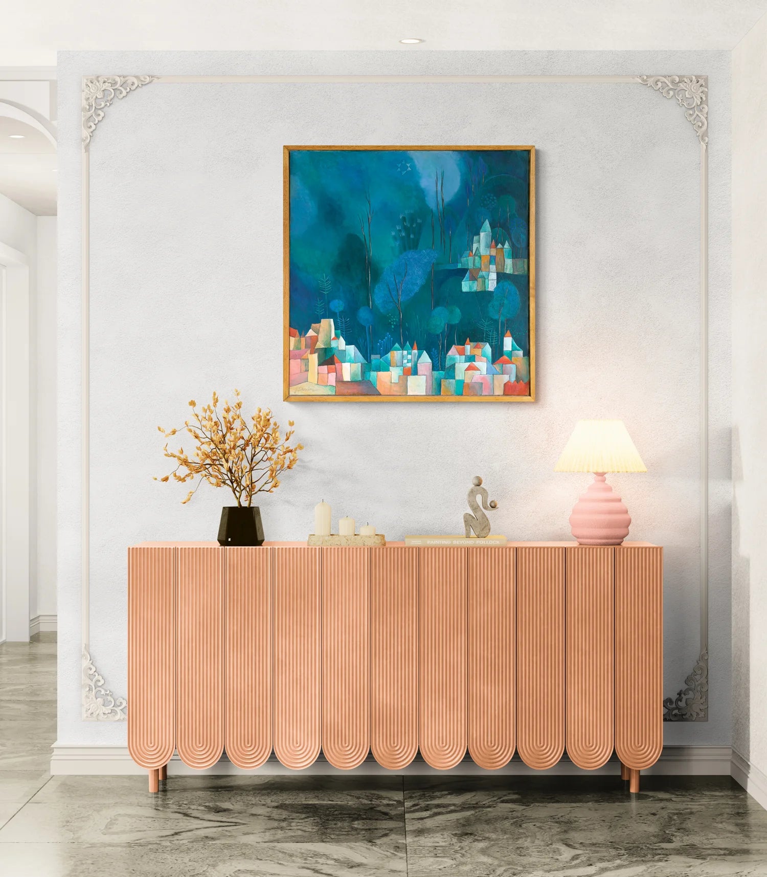 The Village is ideal for children’s rooms, hallways, reading areas, or any interior seeking warmth, imagination, and visual serenity. Its storybook atmosphere and soft palette make it a perfect choice for spaces that wish to include art with a fantastical, gentle, and timeless character, aligned with the aesthetic vision of And-Art Works.