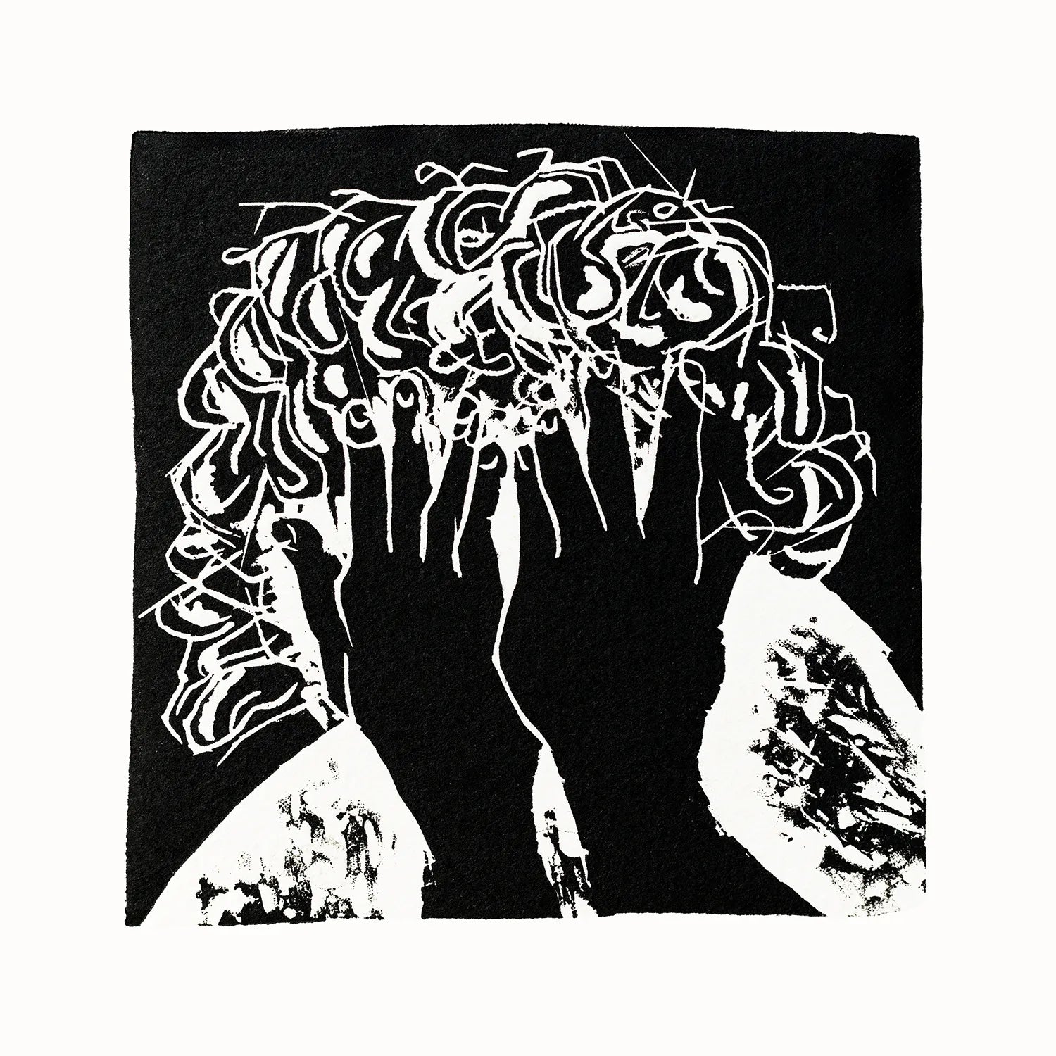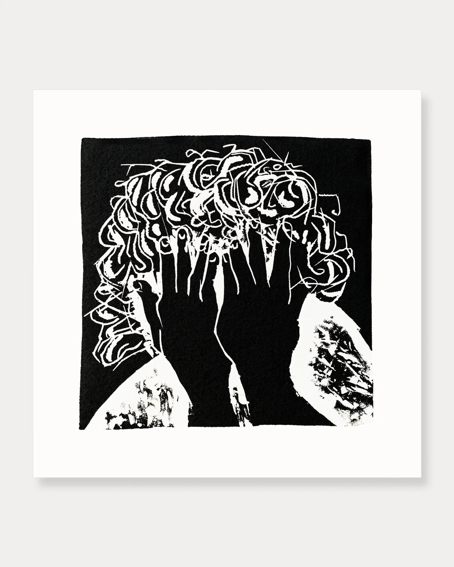 Emerging from the physical process of linocut, the work carries the trace of pressure and incision. Each line is deliberate, carved rather than drawn, leaving behind a raw and direct visual language. The dense structure surrounding the figure feels almost alive — like thoughts that cannot be contained.